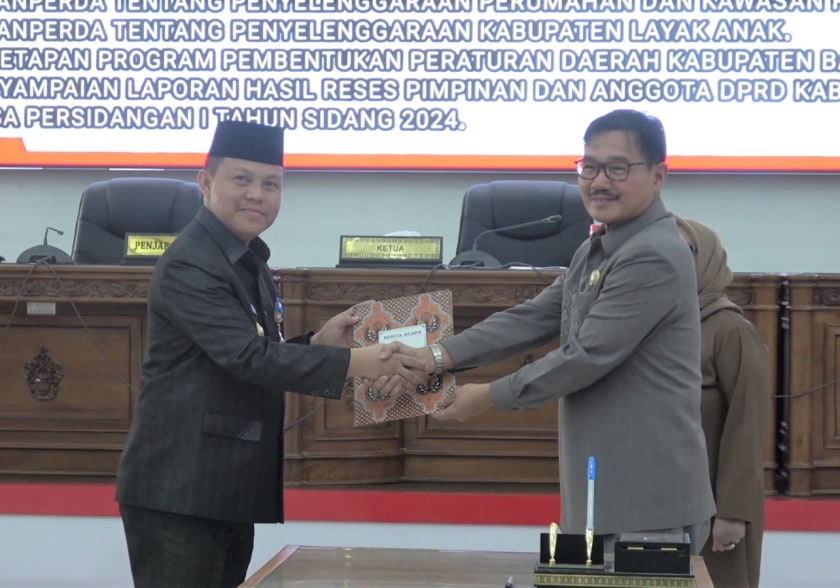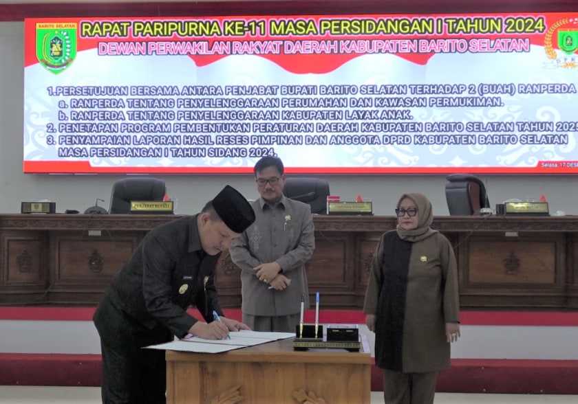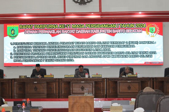 Buntok – Penjabat (Pj) Bupati Barito Selatan Deddy Winarwan menghadiri Rapat Paripurna Ke-11 Masa Persidangan I Tahun 2024 yang digelar di Gedung DPRD Kabupaten Barito Selatan, pada Senin (17/12/2024). Rapat paripurna ini membahas tentang Persetujuan bersama antara Penjabat Bupati Barito Selatan terhadap 2 (dua) Buah Ranperda, a, Ranperda tentang Penyelenggaraan Perumahan dan Kawasan Permukiman, b. Ranperda tentang Penyelenggaraan Kabupaten Layak Anak. Penetapan Program Pembentukan Peraturan Daerah Kabupaten Barito Selatan Tahun 2025 dan Penyampaian Laporan Hasil Reses Pimpinan dan Anggota DPRD Kabupaten Barito Selatan Masa Persidangan I Tahun Sidang 2024.