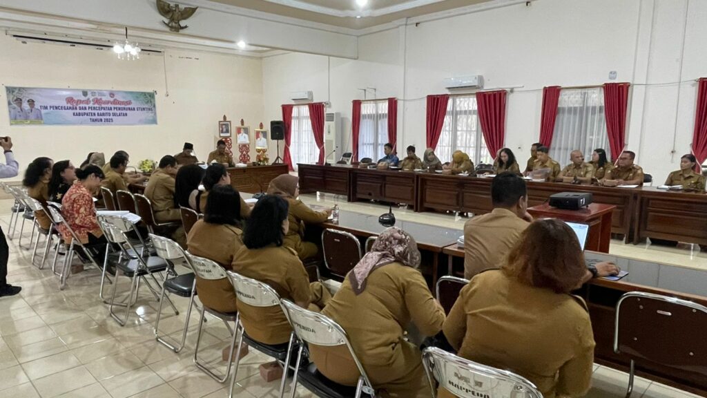 Buntok, 20 Mei 2025 – Dalam upaya mendukung target nasional untuk menurunkan prevalensi stunting, Pemerintah Kabupaten Barito Selatan (Pemkab Barsel) terus menguatkan sinergi lintas sektoral. Wakil Bupati (Wabup) Barsel, Khristianto Yudha, memimpin Rapat Koordinasi Tim Pencegahan dan Percepatan Penurunan Stunting (TPPS) Kabupaten Barsel di Aula Bapperida. Rapat ini dihadiri oleh berbagai pihak terkait, termasuk Kepala Dinas Perumahan Rakyat, Kawasan Permukiman dan Pertanahan (Disperkimtan) Barsel, yang memiliki peran dalam mendukung lingkungan sehat untuk pencegahan stunting, serta seluruh Organisasi Perangkat Daerah (OPD) yang tergabung dalam TPPS.